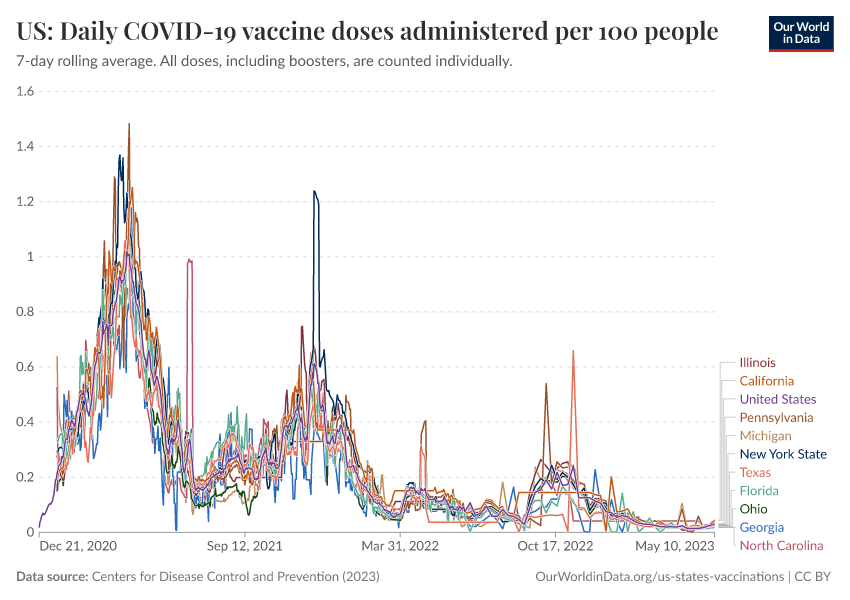 Centers for Disease Control and Prevention (2023) – processed by Our World in Data. “US: Daily COVID-19 vaccine doses administered per 100 people” [dataset]. Centers for Disease Control and Prevention, “COVID-19, Vaccinations (United States)” [original data]. Retrieved March 2, 2026 from https://data-measles-pipeline-fix.owid.pages.dev:8789/20250909-093708/grapher/us-daily-covid-vaccine-doses-per-100.html (archived on September 9, 2025).