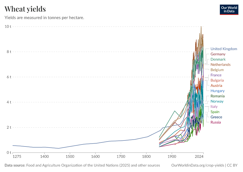 Food and Agriculture Organization of the United Nations (2025); Broadberry et al. (2015); Brassley (2000); Bayliss-Smith & Wanmali (1984) – with major processing by Our World in Data. “Wheat yields” [dataset]. Food and Agriculture Organization of the United Nations, “Production: Crops and livestock products”; Broadberry et al., “Long-term crop yields in UK”; Brassley, “Long-term crop yields in UK”; Bayliss-Smith & Wanmali, “Understanding Green Revolutions” [original data]. Retrieved March 2, 2026 from https://data-measles-pipeline-fix.owid.pages.dev:8789/20260116-143329/grapher/wheat-yields.html (archived on January 16, 2026).