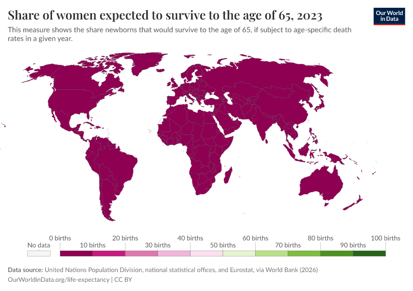 “Data Page: Share of women expected to survive to the age of 65”. Our World in Data (2026). Data adapted from United Nations Population Division (World Population Prospects), via World Bank. Retrieved from https://data-measles-pipeline-fix.owid.pages.dev:8789/20260202-181317/grapher/women-survival-to-age-65.html [online resource] (archived on February 2, 2026).How to cite this data