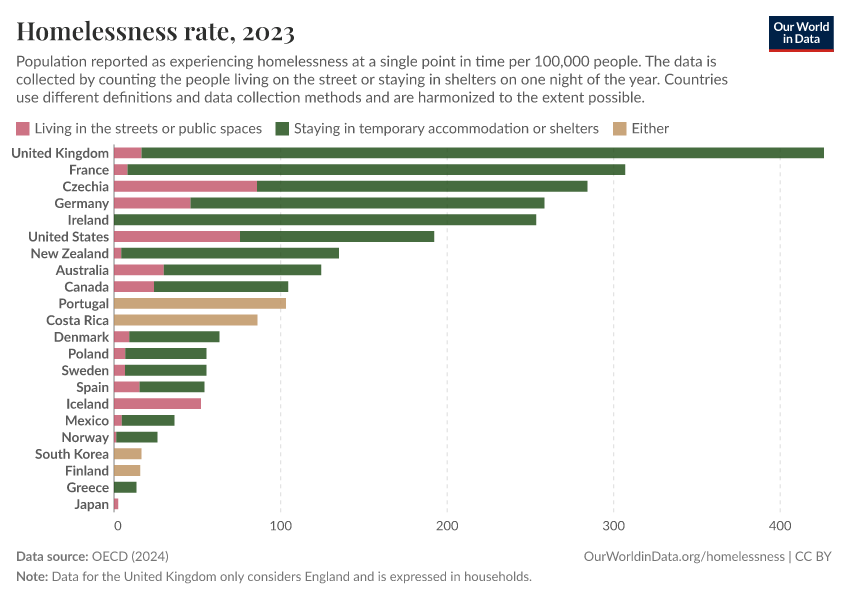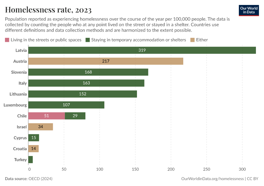 Bastian Herre and Pablo Arriagada (2024) - “Homelessness” Published online at OurWorldinData.org. Retrieved from: 'https://data-measles-pipeline-fix.owid.pages.dev/homelessness' [Online Resource]BibTeX citation