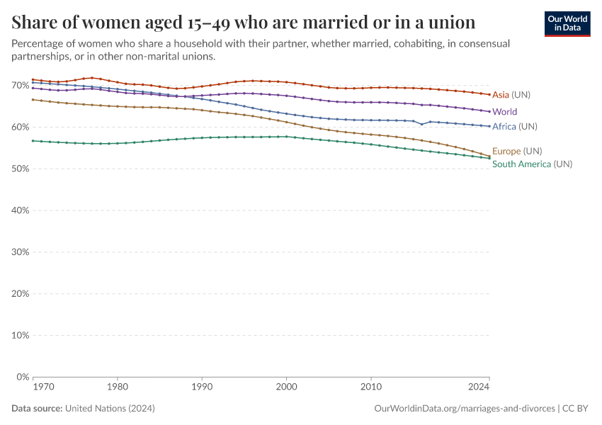 There are differences between regions: the share of women married or in a union has changed less in Asia and South America, and more in Africa, Europe, and North America.