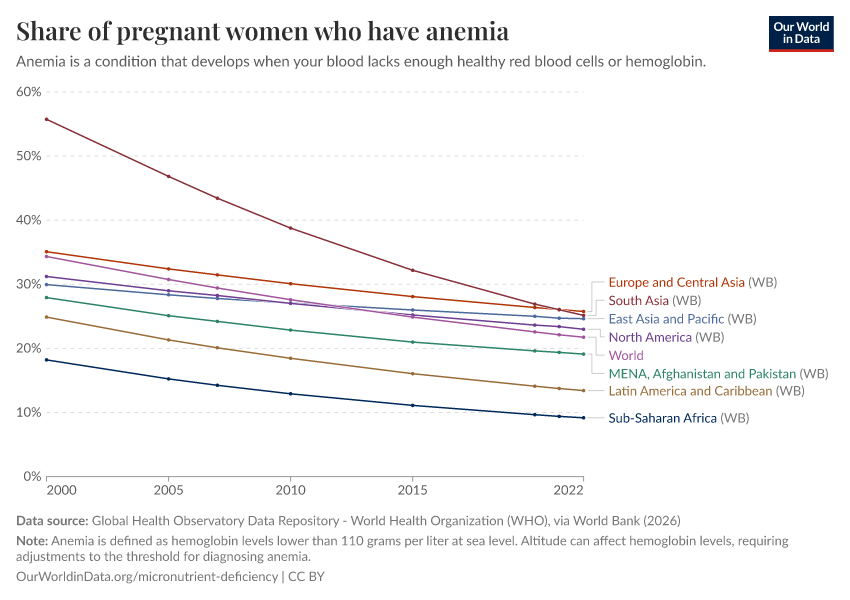 In the chart, we see the prevalence of anemia in pregnant women. Globally, around a third of pregnant women worldwide are anemic.