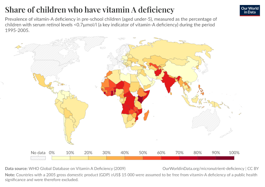 In the map, we see the prevalence of vitamin A deficiency in children under the age of 5, during the period from 1995 to 2005.