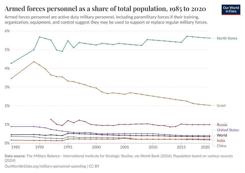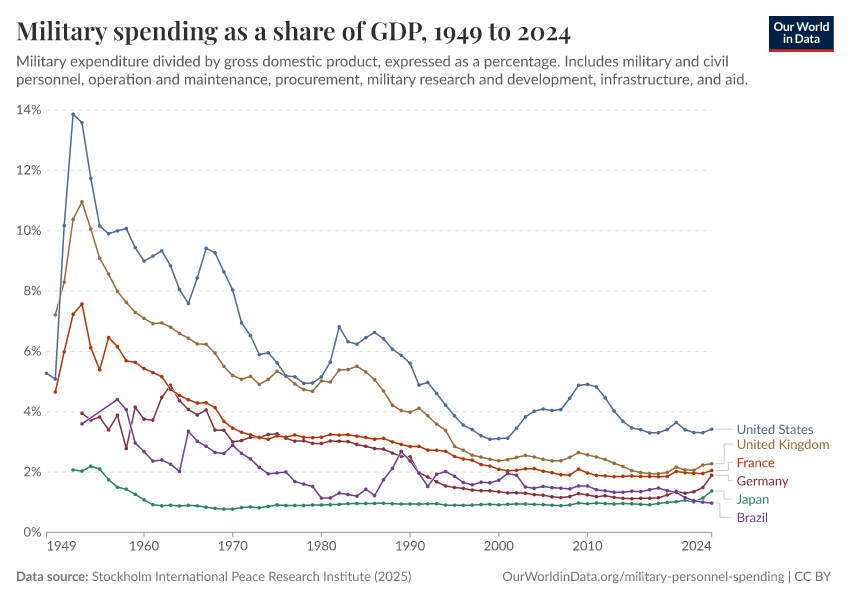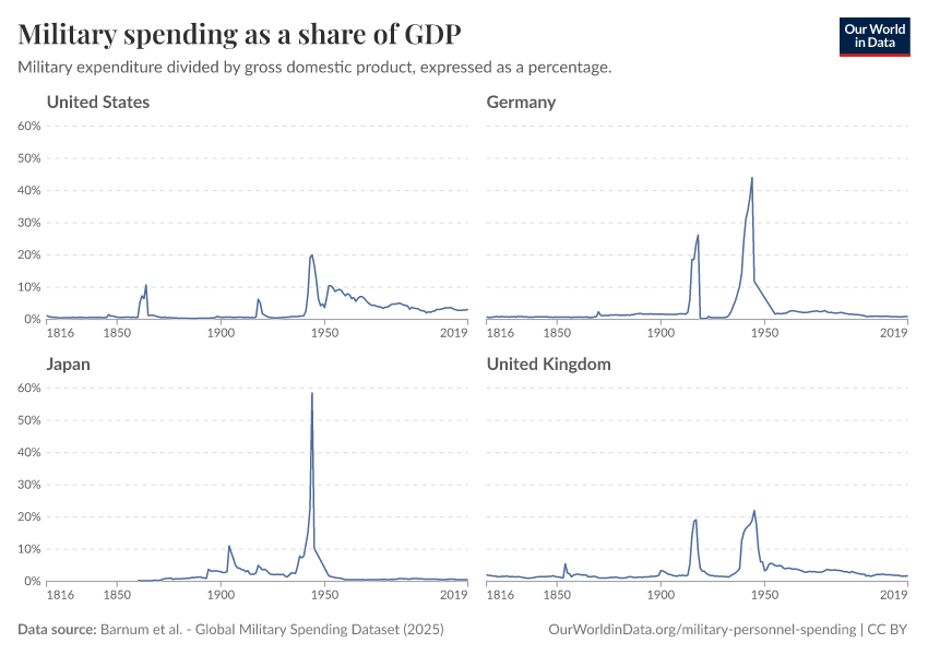 Esteban Ortiz-Ospina (2018) - “Long-run trends in military spending and personnel: four key facts from new data” Published online at OurWorldinData.org. Retrieved from: 'https://data-measles-pipeline-fix.owid.pages.dev:8789/20260202-181317/military-long-run-spending-perspective.html' [Online Resource] (archived on February 2, 2026).BibTeX citation