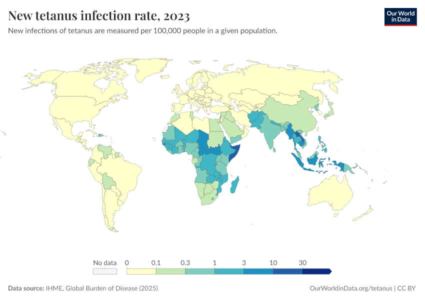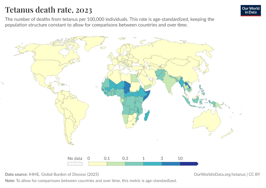 Hannah Behrens, Sophie Ochmann, Bernadeta Dadonaite, and Max Roser (2019) - “Tetanus” Published online at OurWorldinData.org. Retrieved from: 'https://data-measles-pipeline-fix.owid.pages.dev/tetanus' [Online Resource]BibTeX citation
