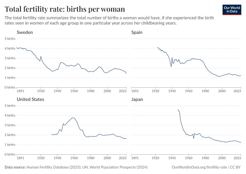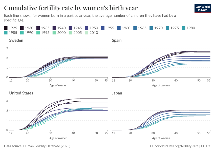 Saloni Dattani and Lucas Rodés-Guirao (2025) - “Why the total fertility rate doesn’t necessarily tell us the number of births women eventually have” Published online at OurWorldinData.org. Retrieved from: 'https://data-measles-pipeline-fix.owid.pages.dev:8789/20260225-014904/total-fertility-rate-births-per-woman.html' [Online Resource] (archived on February 25, 2026).BibTeX citation