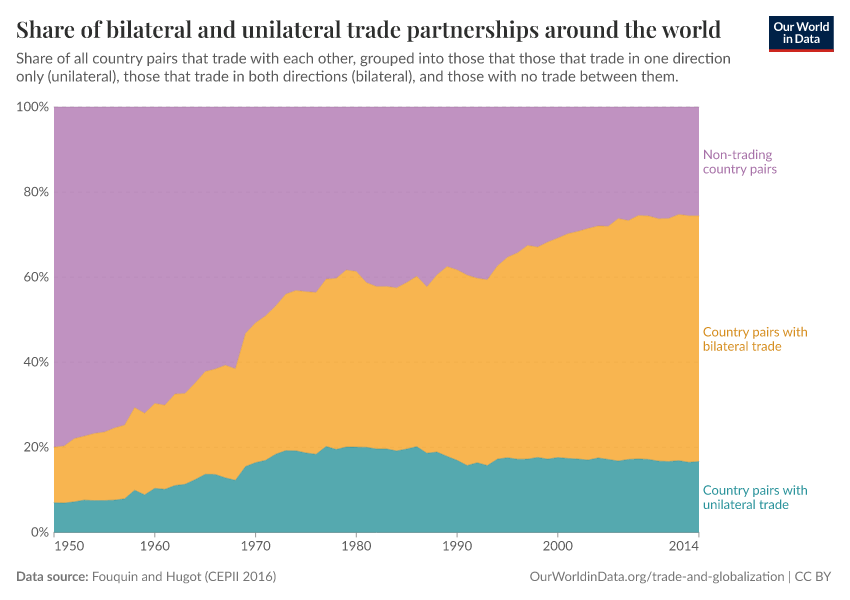 In the chart, all possible country pairs are partitioned into three categories: the top portion represents the fraction of country pairs that do not trade with one another; the middle portion represents those that trade in both directions (they export to one another); and the bottom portion represents those that trade in one direction only (one country imports from, but does not export to, the other country).