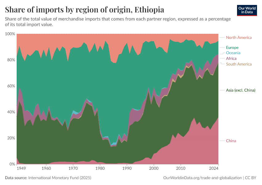 Ethiopia, home to around 130 million people, is one of Africa’s largest countries and has experienced rapid economic growth in recent decades. In the early 1990s, over 40% of Ethiopia’s imports came from Europe, while very little came from China. Since then, the roles of China and Europe have almost reversed. Imports from China now account for one-third of Ethiopia’s total imported goods.10