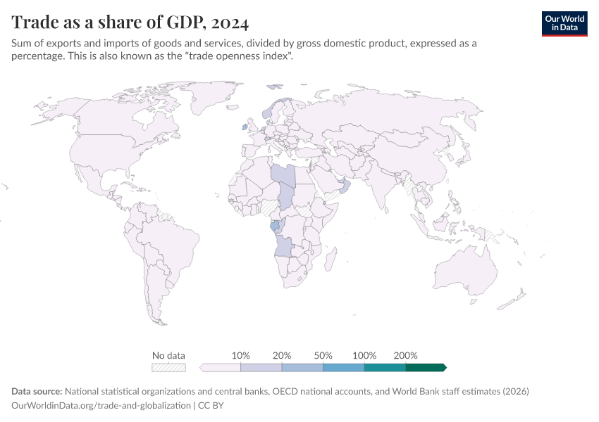 If you press the play button on the map, you can see how trade openness has changed over time across all countries.