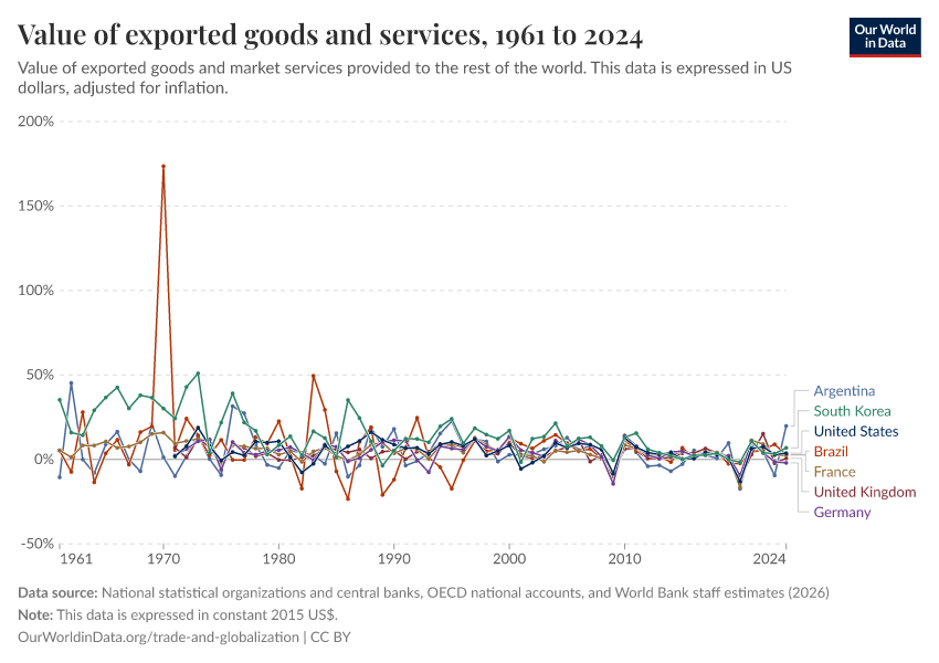 The chart shows the value of exports (goods and services) in US dollars, country by country, after adjusting for inflation.
