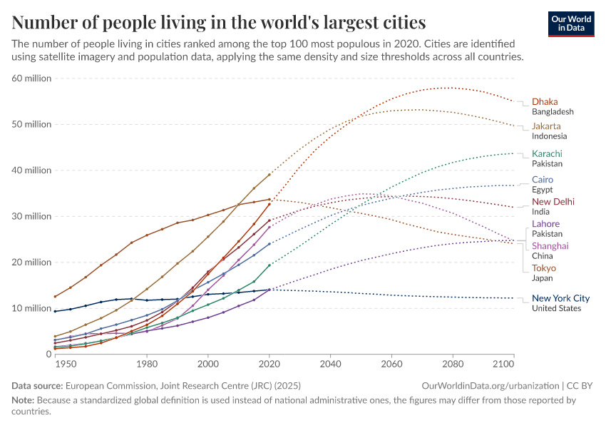 Using the "Edit cities" in the top-right of the chart, you can browse trends for the largest 100 cities. The UN provides different — often significantly lower — estimates for the largest cities, as it uses nationally defined boundaries.