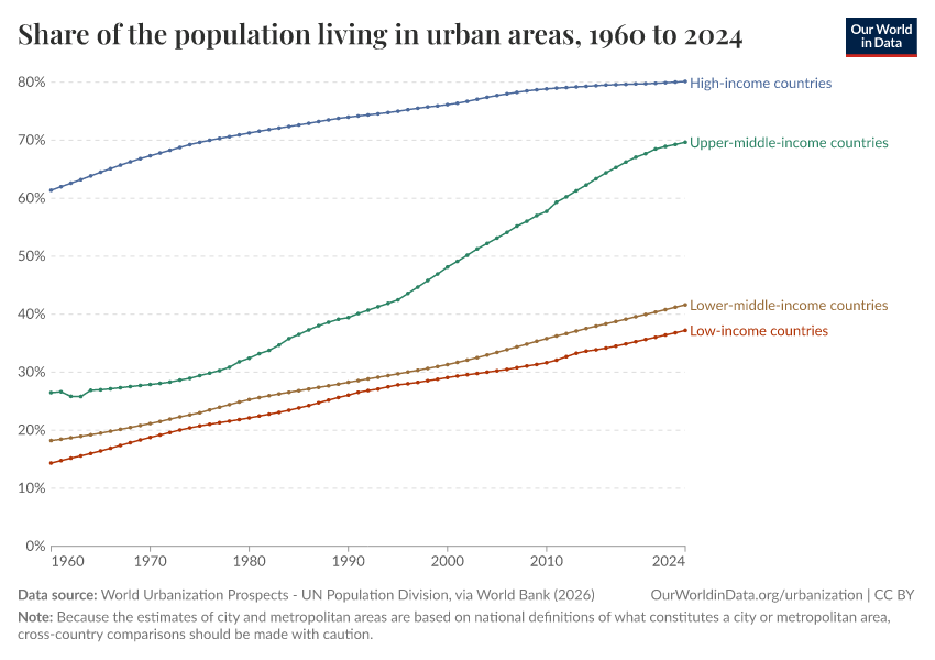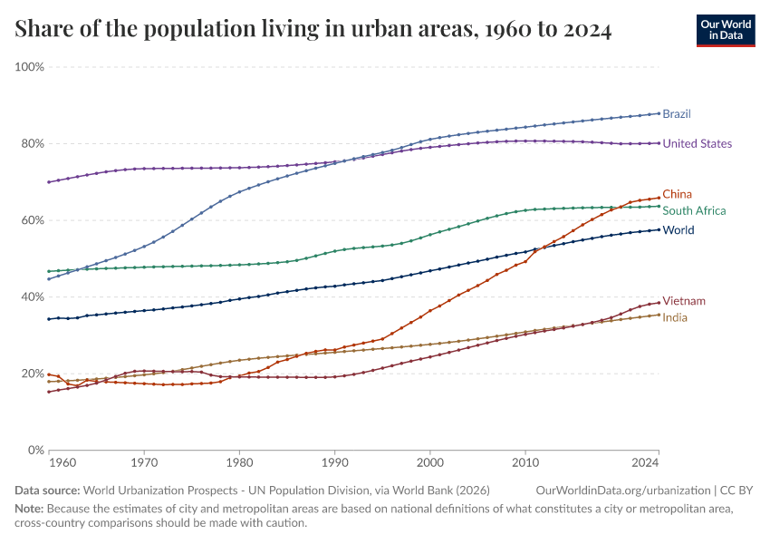 Hannah Ritchie, Veronika Samborska, and Max Roser (2024) - “Urbanization” Published online at OurWorldinData.org. Retrieved from: 'https://data-measles-pipeline-fix.owid.pages.dev/urbanization' [Online Resource]BibTeX citation