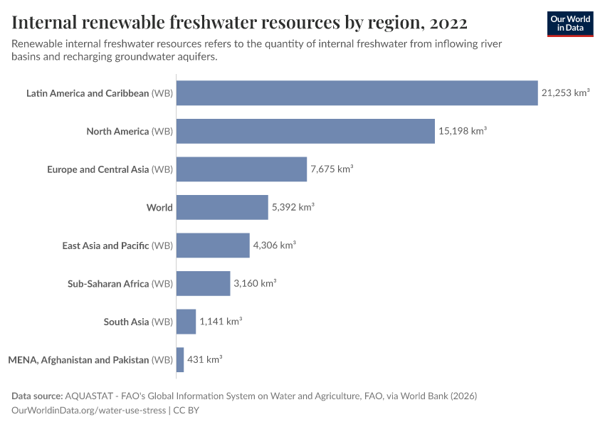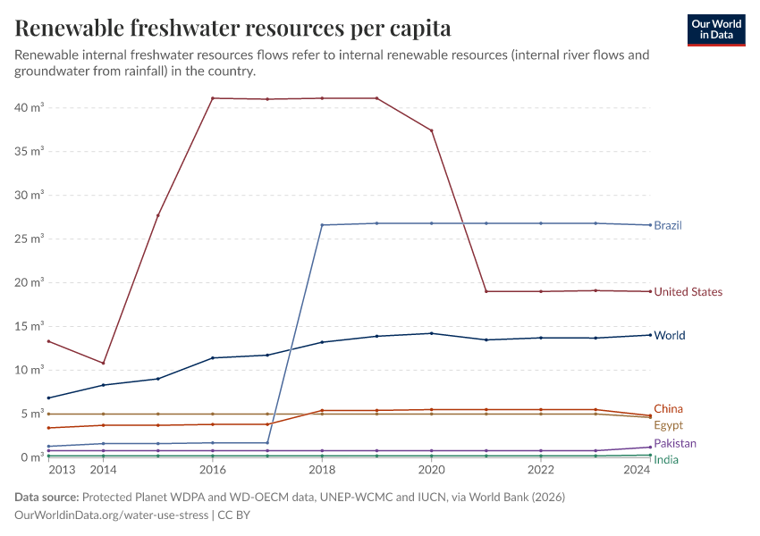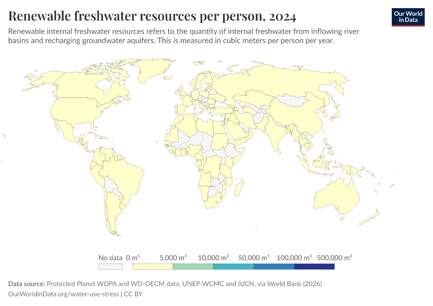 Renewable internal flows are, therefore, an important indicator of water security or scarcity. If rates of freshwater withdrawal begin to exceed the renewable flows, resources begin to decline. The chart shows the level of renewable internal freshwater resources per capita.