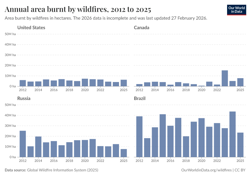 Veronika Samborska and Hannah Ritchie (2024) - “Wildfires” Published online at OurWorldinData.org. Retrieved from: 'https://data-measles-pipeline-fix.owid.pages.dev/wildfires' [Online Resource]BibTeX citation