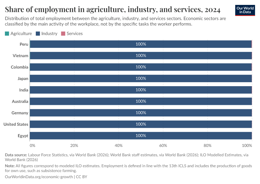 Looking at employment by economic sector helps understand how employment patterns change as countries develop. As incomes rise, workers tend to move out from agriculture into industry and then into services — a shift often referred to as “structural transformation”.